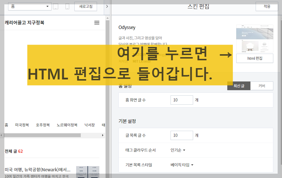 그리고, 티스토리의 HTML 코드로 들어갑니다.