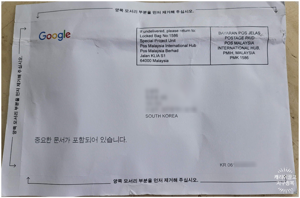 비 오는 날 아파트 편지함에 이렇게 말레이시아에서 온 구글 편지가 도착했답니다.