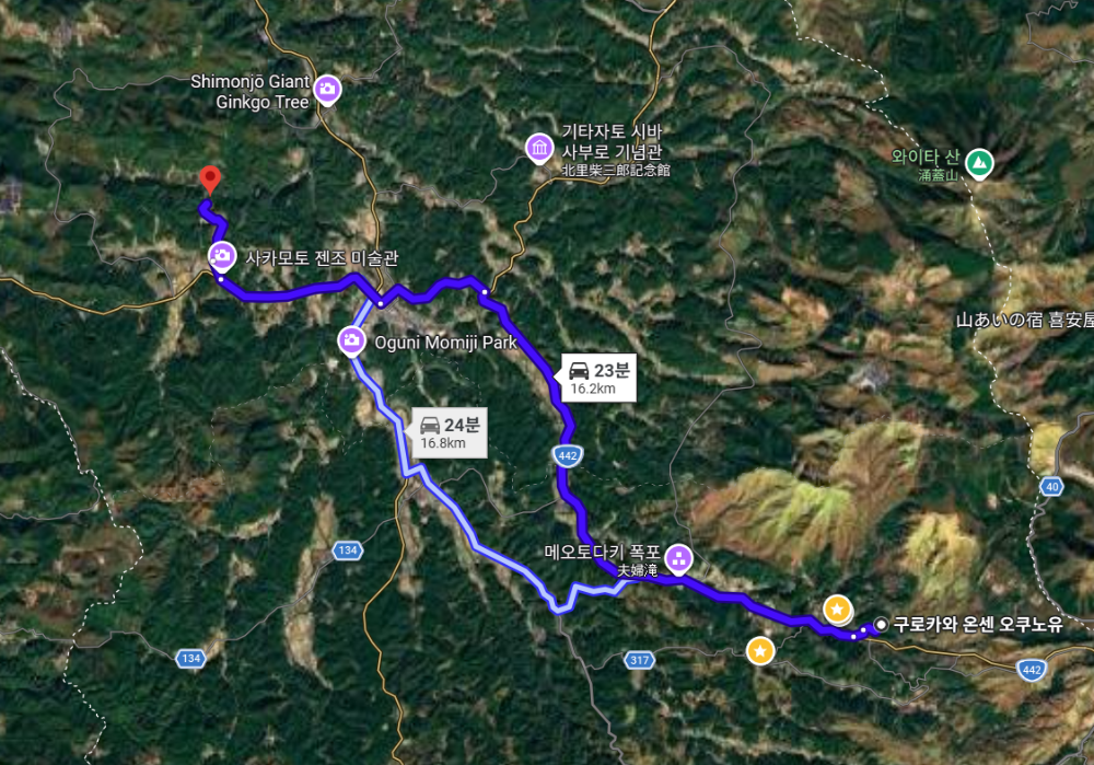 쿠로카와 온천에서는 차로 약 20분(16km) 정도 걸리는 아주 가까운 거리입니다.
