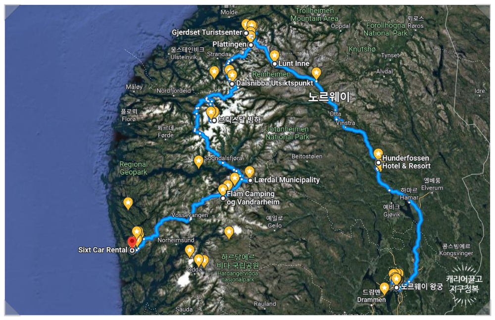 노르웨이를 여행하는 방법은 다양하지만, 캐끌지정 가족들은 오슬로(Oslo)로 In 하고, 베르겐(Bergen)에서 Out 하는 효율적인 경로로 여행을 했습니다. 렌터카는 오슬로 공항에서 빌려 베르겐 공항에 반납했죠. 약 1,100km 정도를 운전했는데, 압도적인 대자연의 경치를 보며 유유자적 다녔더니 피로감이 전혀 없는 힐링 그 자체였습니다.