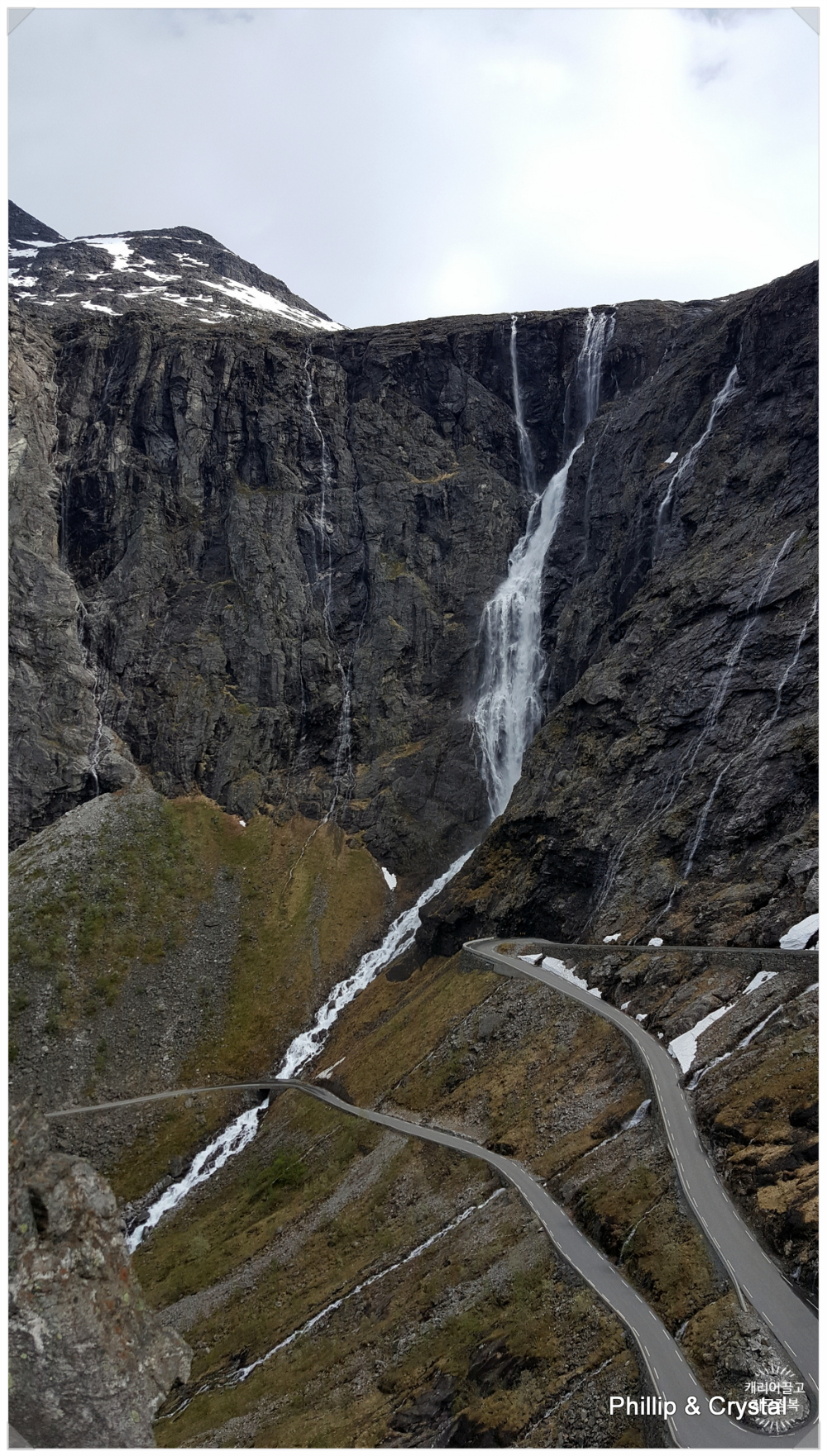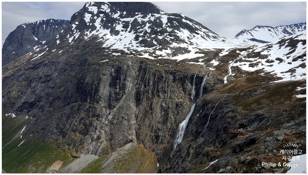 폭포의 수량이 워낙 엄청나서 다리를 지날 땐 차창 밖으로 물보라가 세차게 들이칩니다. 이런 거칠고 위험한 산세에 기어이 길을 뚫고 다리를 놓아버린 노르웨이 사람들의 토목 기술에 그저 감탄만 나올 뿐입니다.