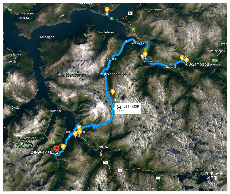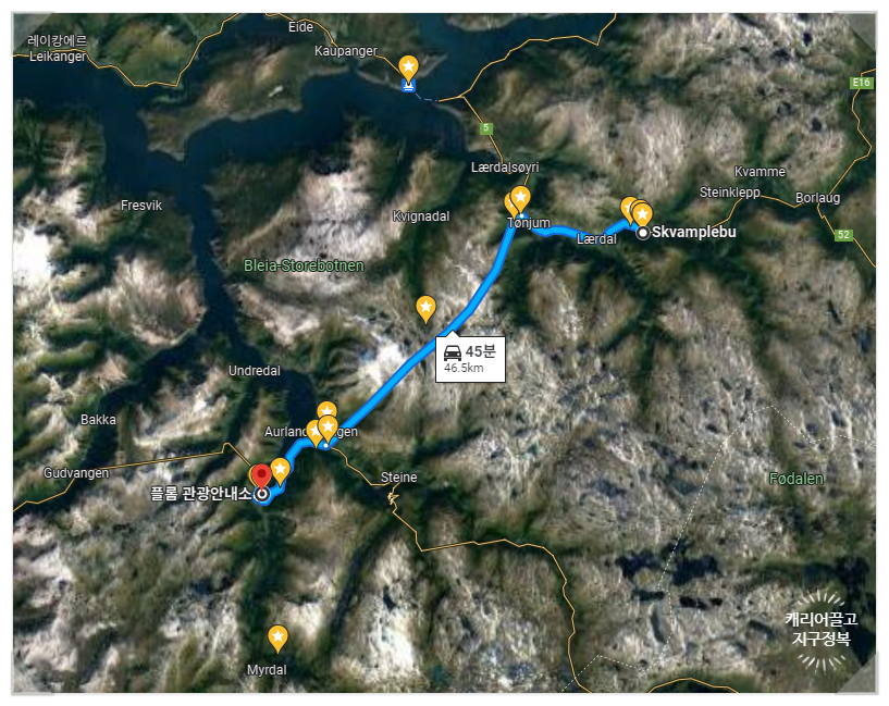 만약 일정에 여유가 조금 있으시다면, 레르달 터널을 통과하지 않고 산 위로 구불구불 올라가서 풍경을 감상하며 넘어가는 '스노우 로드(Aurlandsfjellet)' 코스를 100배 더 강력히 추천합니다!