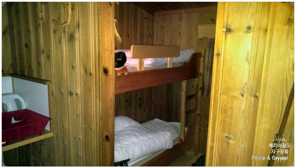 오두막 안에는 튼튼한 2층 침대가 2개 놓여 있어서 4인 가족이 뒹굴며 자기 딱 좋습니다. (아이들은 무조건 2층으로 올라가려고 싸우죠.)