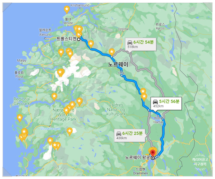 수도 오슬로(Oslo)에서 출발한다면, 목적지인 트롤스티겐 입구까지는 대략 6시간, 452Km 거리입니다.