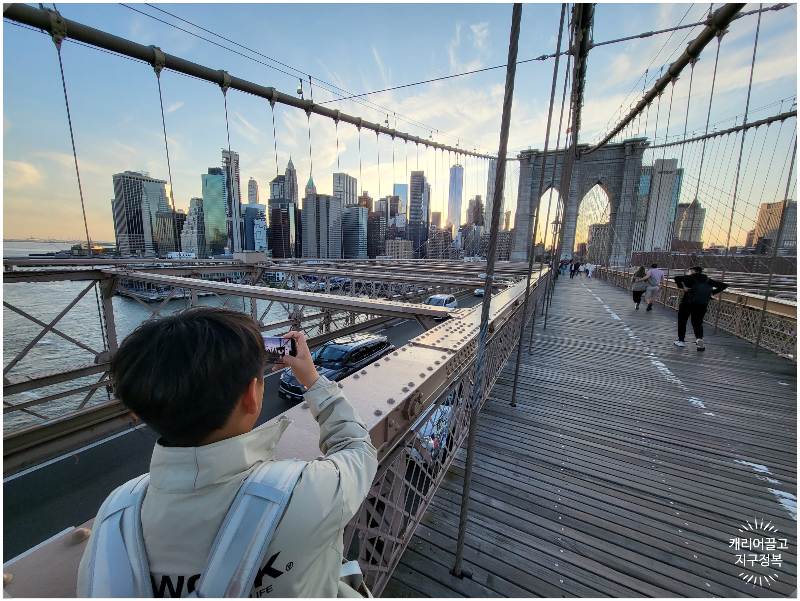 다시 배를 타고 맨해튼으로 돌아오면 벌써 6시 30분, 해가 뉘엿뉘엿 지고 뉴욕의 야경이 시작될 시간입니다. 이제 브루클린 다리를 건너 덤보(DUMBO)로 향합니다. (다리 입구에서 자전거를 대여할 수도 있지만, 왕복 반납의 번거로움 때문에 아이들과 함께 도보로 걷기로 했습니다.)