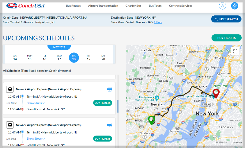 뉴어크 공항 호텔에서 맨해튼 시내로 들어가려면 공항버스를 타야 합니다. 버스는 터미널 A, B, C를 거쳐 맨해튼의 그랜드 센트럴 터미널까지 약 1시간 10분이 소요됩니다.