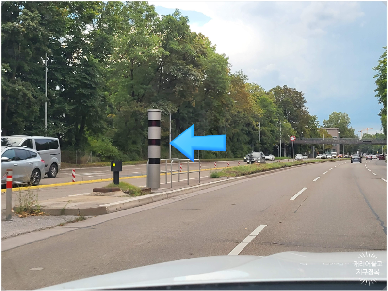 아래 사진의 회색 기둥이 바로 속도위반 감시 카메라(Säulenblitzer)입니다.