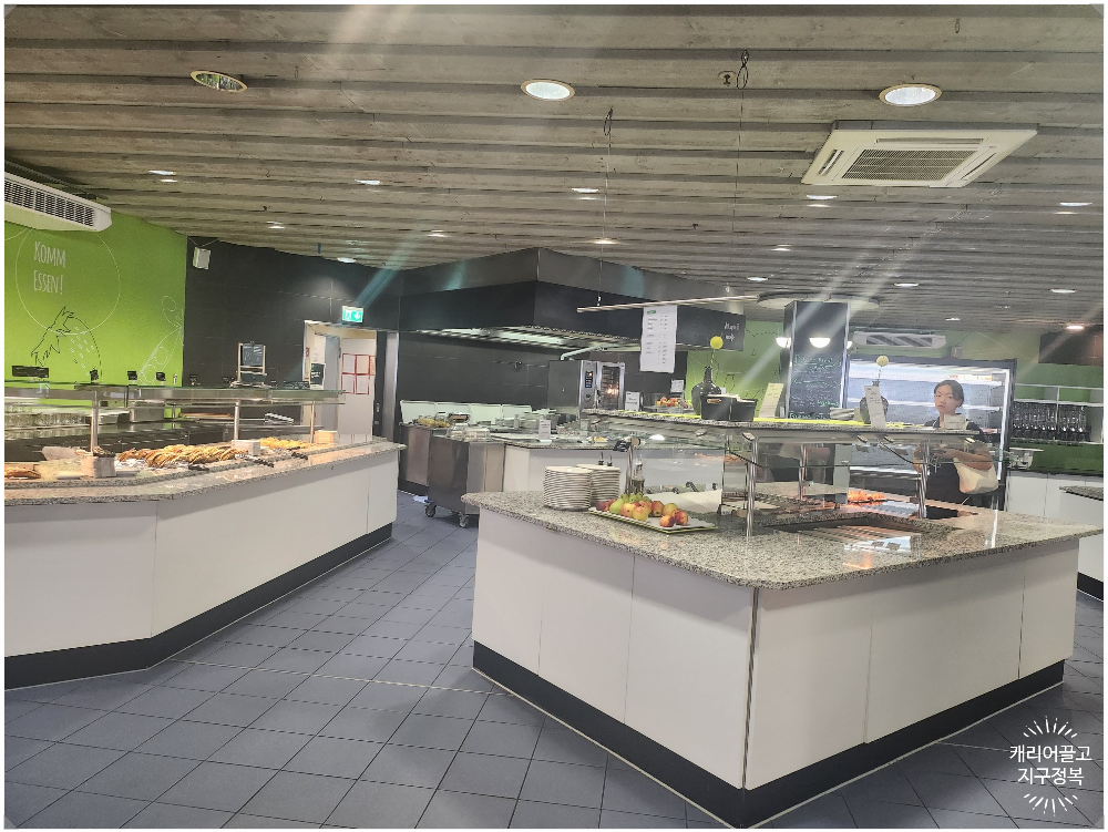 학생 복지센터 1층에 위치한 이곳 학생식당(멘자)은 뷔페식으로 운영됩니다. 먹고 싶은 메뉴를 접시에 담은 후, 계산대에서 '음식의 무게(g)'를 달아서 그만큼만 요금을 지불하는 아주 합리적인 시스템입니다.