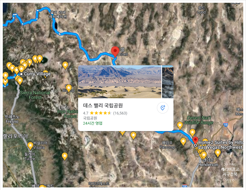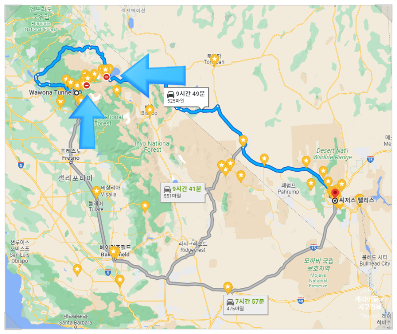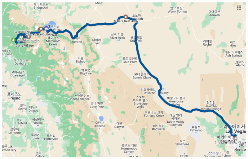어쩔 수 없이 요세미티 북쪽으로 크게 우회하거나, 아니면 남쪽인 베이커스필드(Bakersfield)까지 쭉 내려와서 거의 LA 근처를 찍고 다시 라스베이거스로 올라가야 합니다. 이렇게 되면 하루 만에 이동하는 건 거의 불가능에 가깝죠.