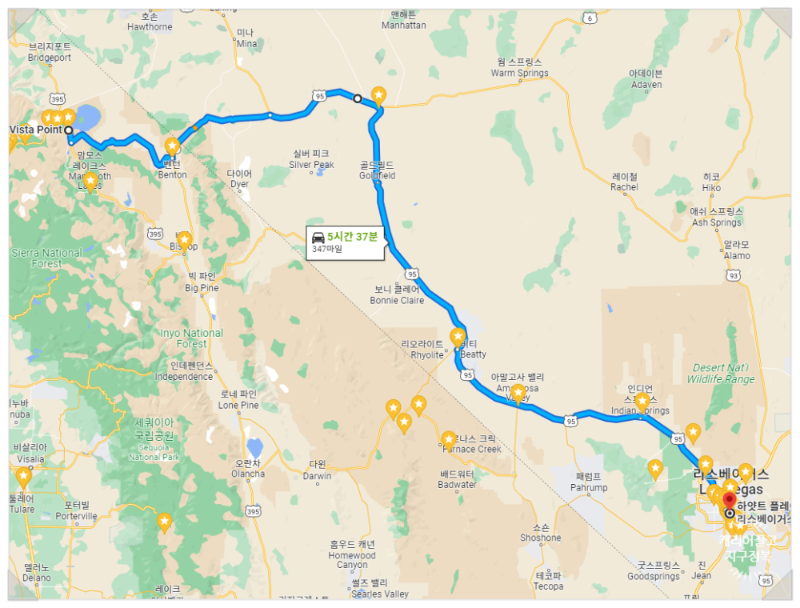 하지만 요세미티에서 라스베이거스까지 자동차로 곧바로 쏘는 일정은 쉬지 않고 달려도 최소 9시간이 소요되는 꽤나 하드코어한 모험입니다.