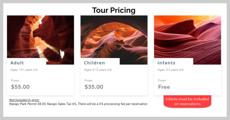 2026년 기준 기본 일반 투어(General Tour) 요금은 성인 1인당 약 $55~$60 수준입니다. (나바호 자치구역 환경 보호 기금 8달러와 예약 수수료, 세금은 별도입니다.)