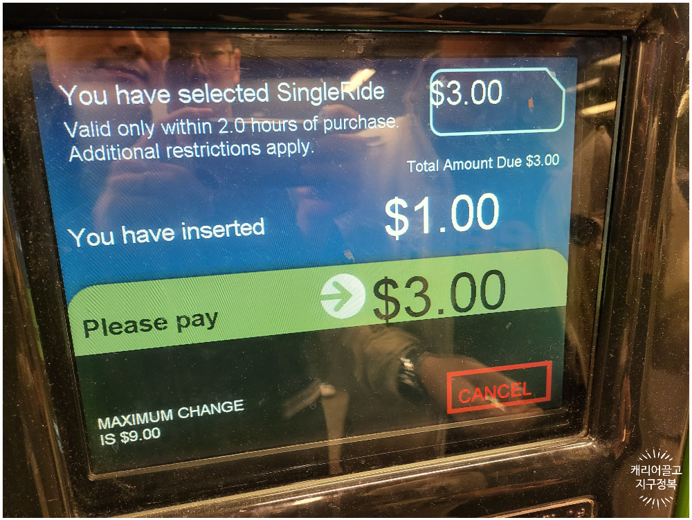한 번은 카드와 현금으로 3$짜리 싱글 티켓 4개를 사서 탔고,