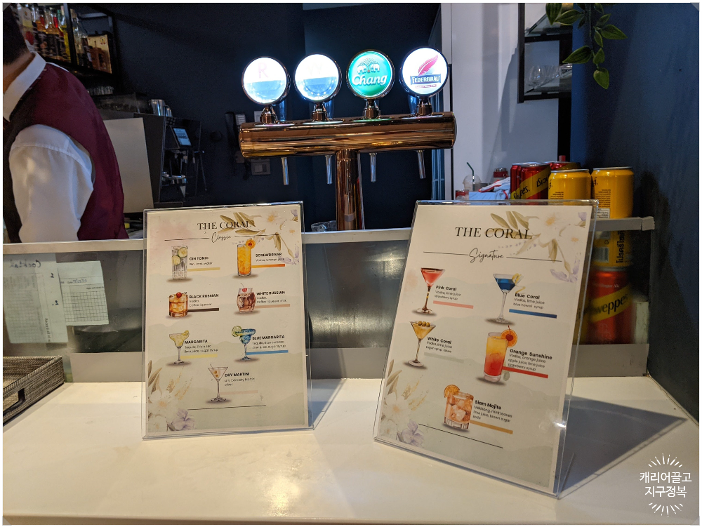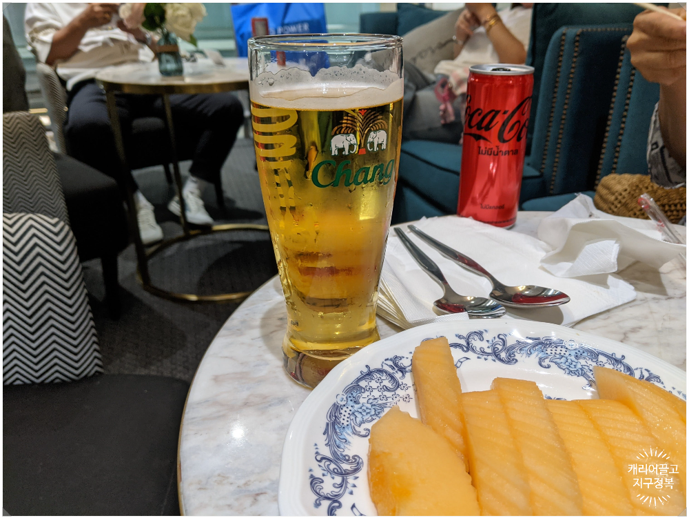 다른 라운지들은 캔맥주나 와인을 직접 가져다 먹는 방식이 많은데, 이곳은 바텐더에게 요청하면 태국 싱하(Singha) 생맥주는 물론, 진토닉, 보드카 토닉 같은 칵테일을 즉석에서 만들어 줍니다. 그것도 무제한으로요!