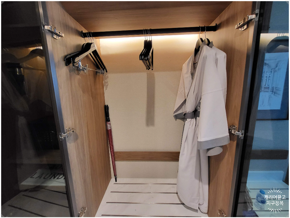 예쁜 호텔 가운과 작은 미니홈바,
