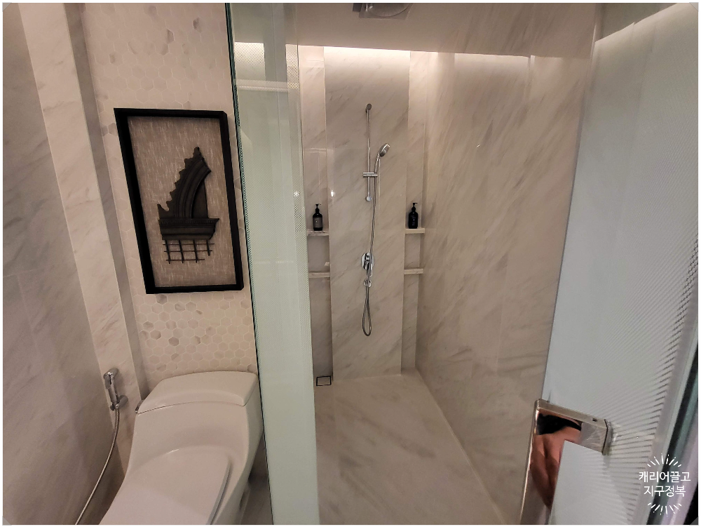 화장실과 욕실은 전체가 고급스러운 대리석으로 마감되어 있어 정말 깔끔했습니다.