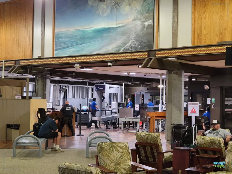 9.11 테러 이후 미국 내 모든 공항의 보안이 대폭 강화되었지만, 주내선(Inter-island) 위주로 운영되는 힐로 공항의 검색은 놀라울 정도로 부드럽고 신속하게 진행되었습니다. 사진에 보이는 작고 개방된 공간이 보안 검색 구역의 전부입니다.