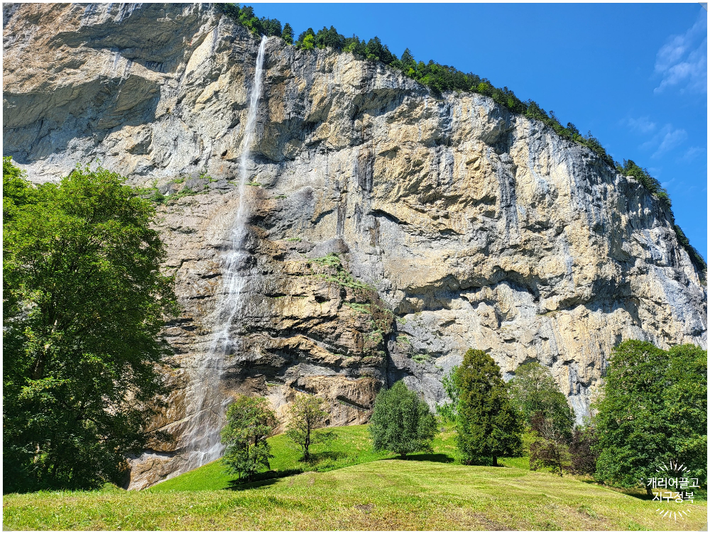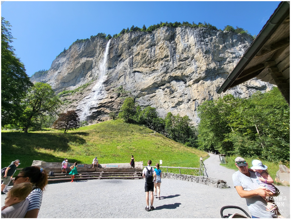 높이가 약 300m에 달해 멀리서 보면 웅장하지만, 솔직히 가까이 가서 보면 수량이 엄청나게 풍부한 편은 아니라 물줄기가 가늘게 흩날리는 나이아가라(?) 느낌은 안 납니다. (그래서 이름도 '먼지'라는 뜻의 Staub가 붙었다고 하네요.)