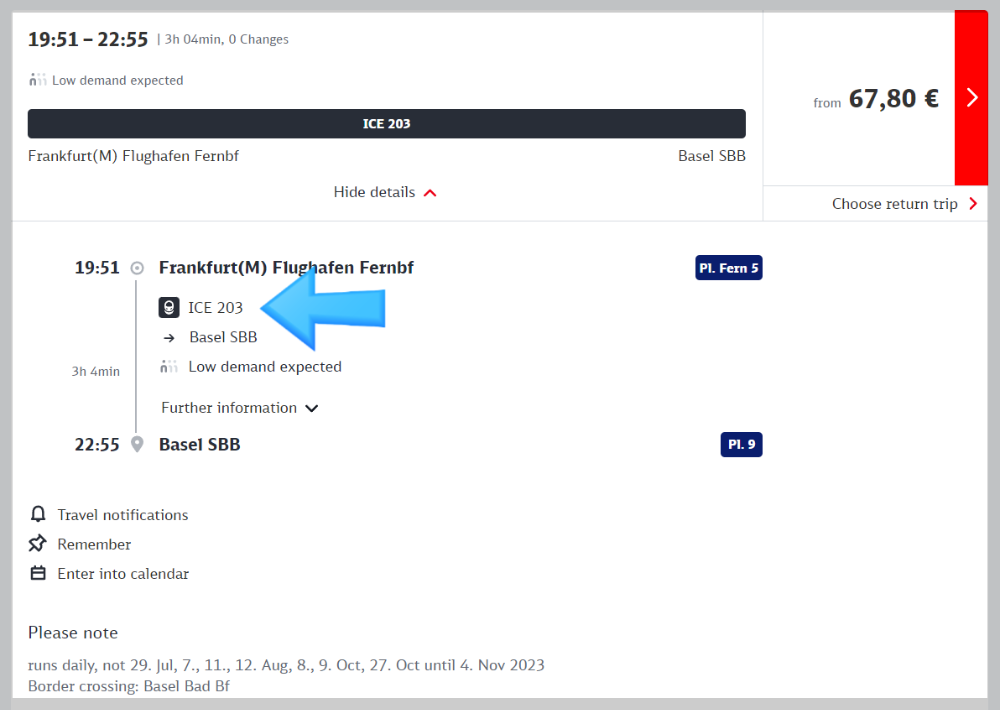 ICE 203을 선택해 보면, 아래와 같이 세부 정차 역을 보여줍니다.