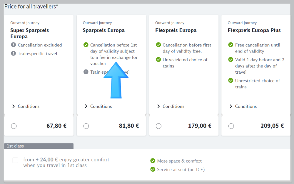 1등석으로 바꾸는데 22유로가 추가된다고 나옵니다.
