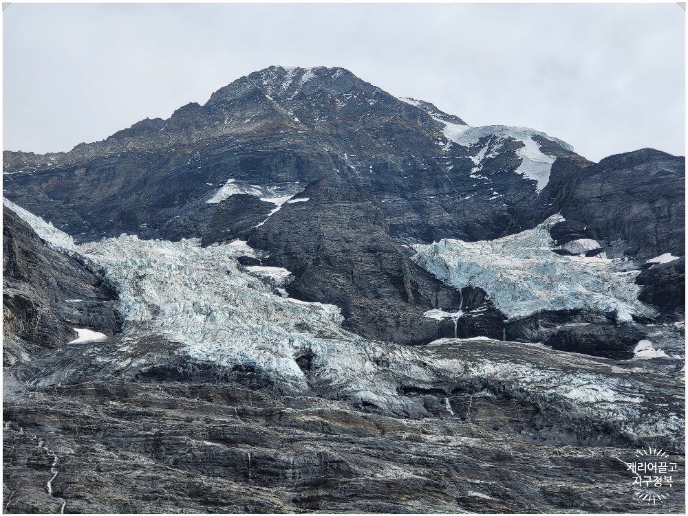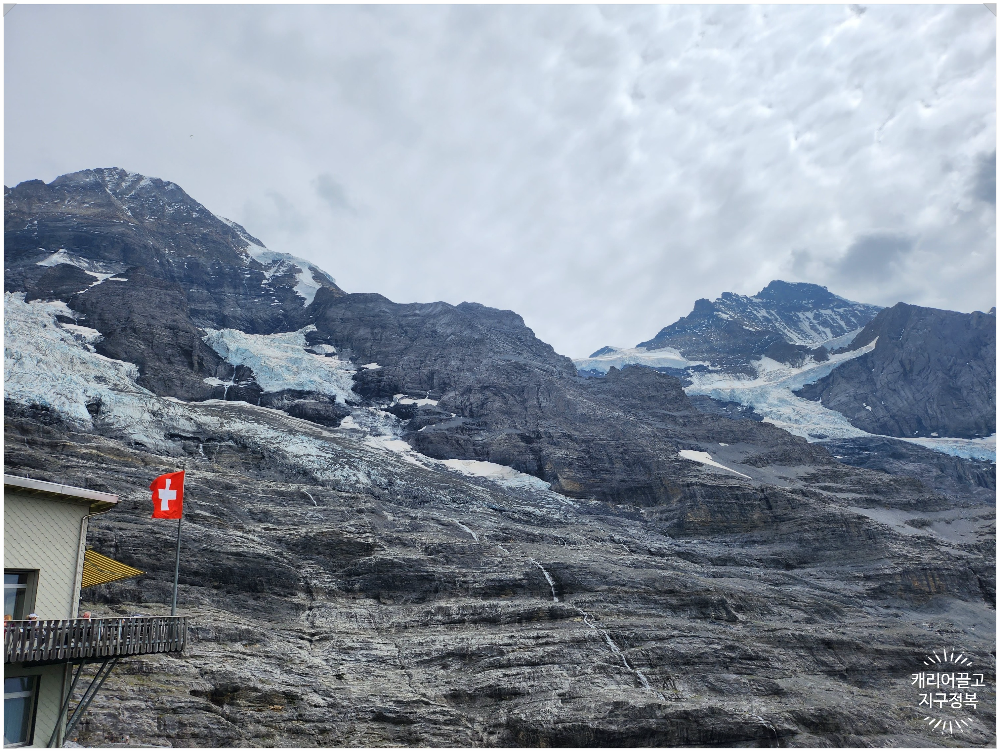 이곳 전망대 바깥으로 나가면 방금 다녀왔던 융프라우 산 쪽의 어마어마한 빙하(Glacier) 지대가 코앞에서 맨눈으로 선명하게 펼쳐집니다.