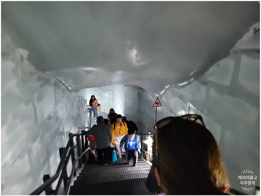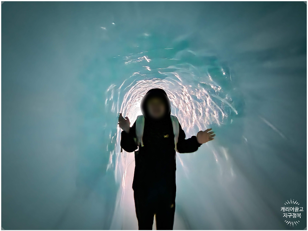 햇빛이 쨍쨍한 밖보다도, 심지어 외부 눈밭 전망대보다도 이 실내 빙하 터널 안이 체감상 가장 춥습니다. 말 그대로 가동 중인 대형 냉동고 안에 갇혀 있는 느낌이거든요.