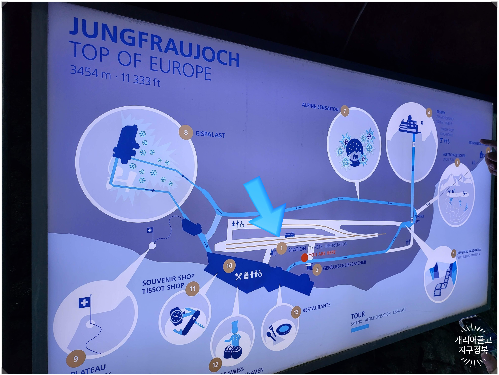 벽과 천장에 있는 파란색 'TOUR' 화살표와 1번부터 10번까지 매겨진 숫자 표지판만 순서대로 따라 걸어가면 융프라우요흐 내부의 모든 시설을 쏙쏙 빼놓지 않고 관람할 수 있는 구조로 완벽하게 설계되어 있습니다.