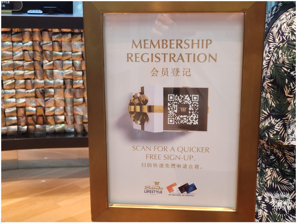 여기서 여권을 제시하고 '샌즈 라이프스타일(Sands LifeStyle)' 멤버십에 무료로 가입하실 수 있습니다.