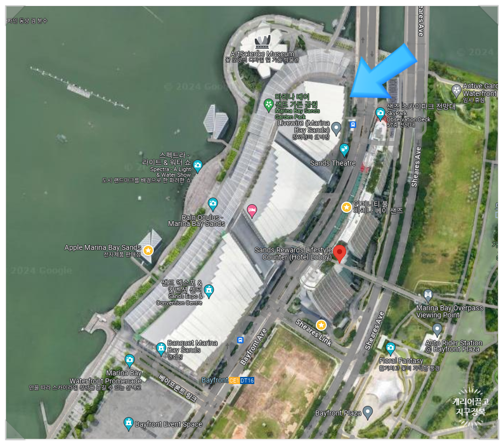 마리나베이샌즈 호텔은 3개의 거대한 건물이 연결되어 있는 구조인데, 워낙 규모가 커서 자동차가 하차할 수 있는 로비 입구가 몇 군데로 정해져 있습니다. 위 지도의 센트럴 에어리어 쪽 하차 지점을 선택해서 가시는 것이 동선상 가장 좋습니다.