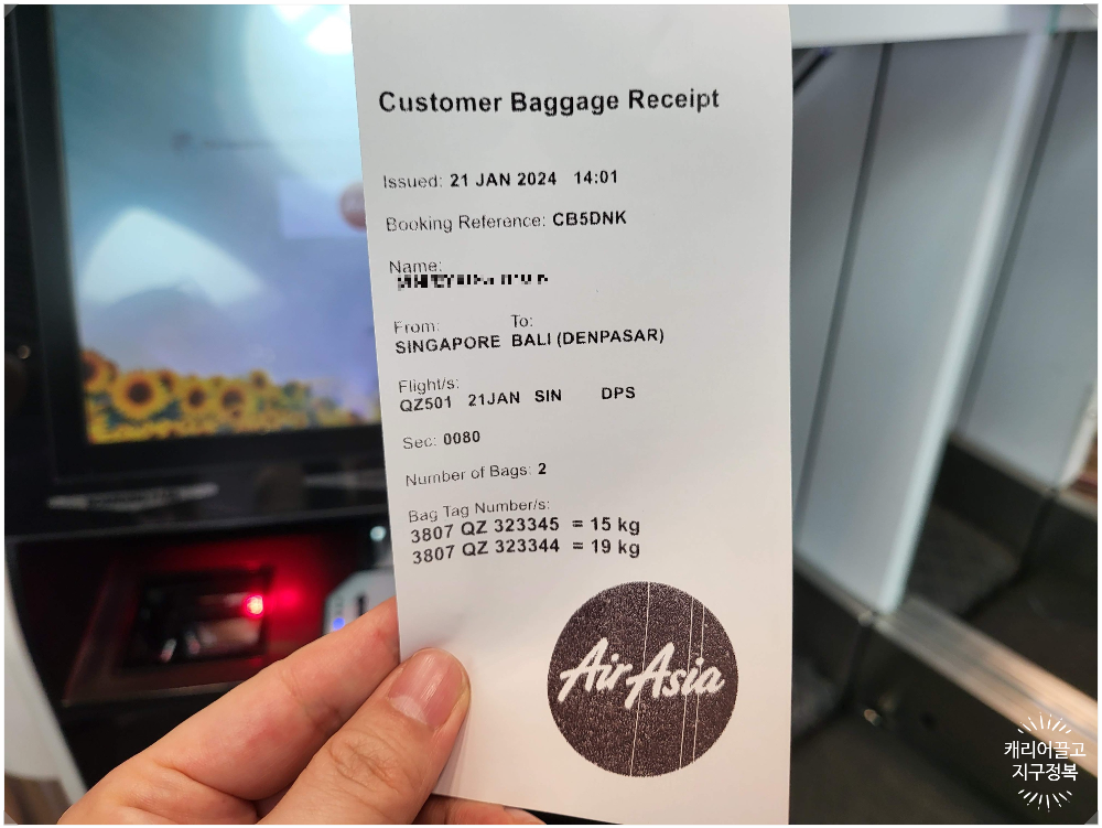 정보가 맞으면 버튼을 누르고, 기계에서 찌익- 하고 튀어나오는 길쭉한 스티커(수하물 태그)를 받습니다.