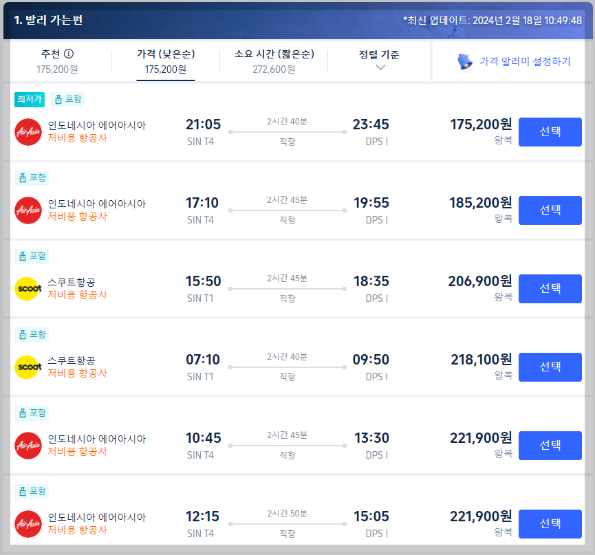 싱가포르 창이공항에서 발리 덴파사르 공항까지는 비행시간 약 2시간 50분 거리로 아주 가깝습니다.