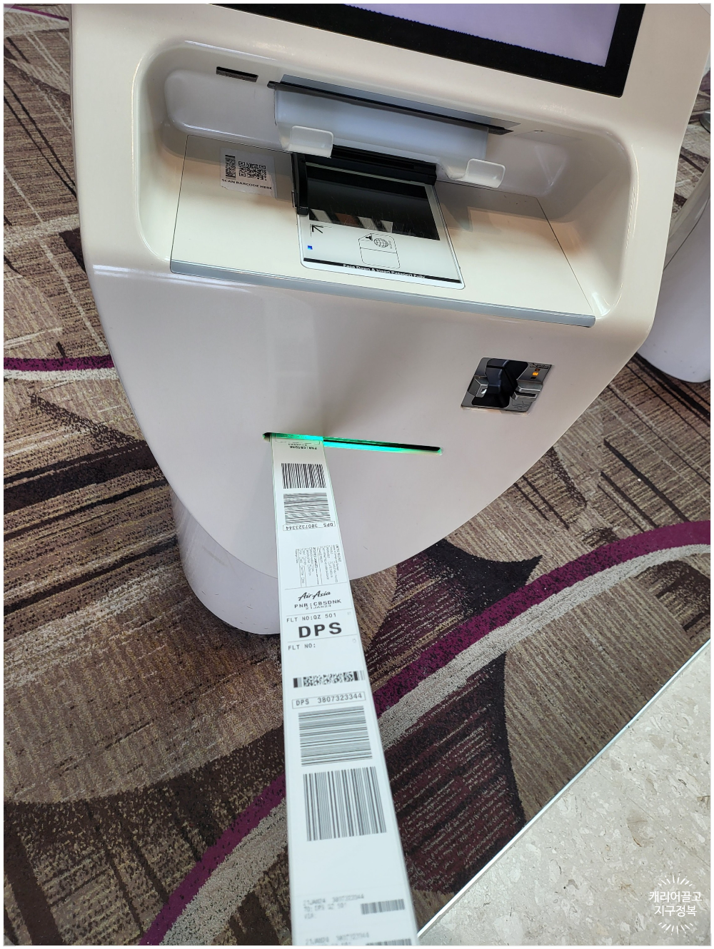 카운터 직원이 없으니 당연히 수하물도 승객 본인이 직접 스티커(수하물 태그)를 뽑아서 캐리어에 붙이고, 컨베이어 벨트에 올리는 '셀프 백드랍(Self Bag Drop)'을 해야 합니다.