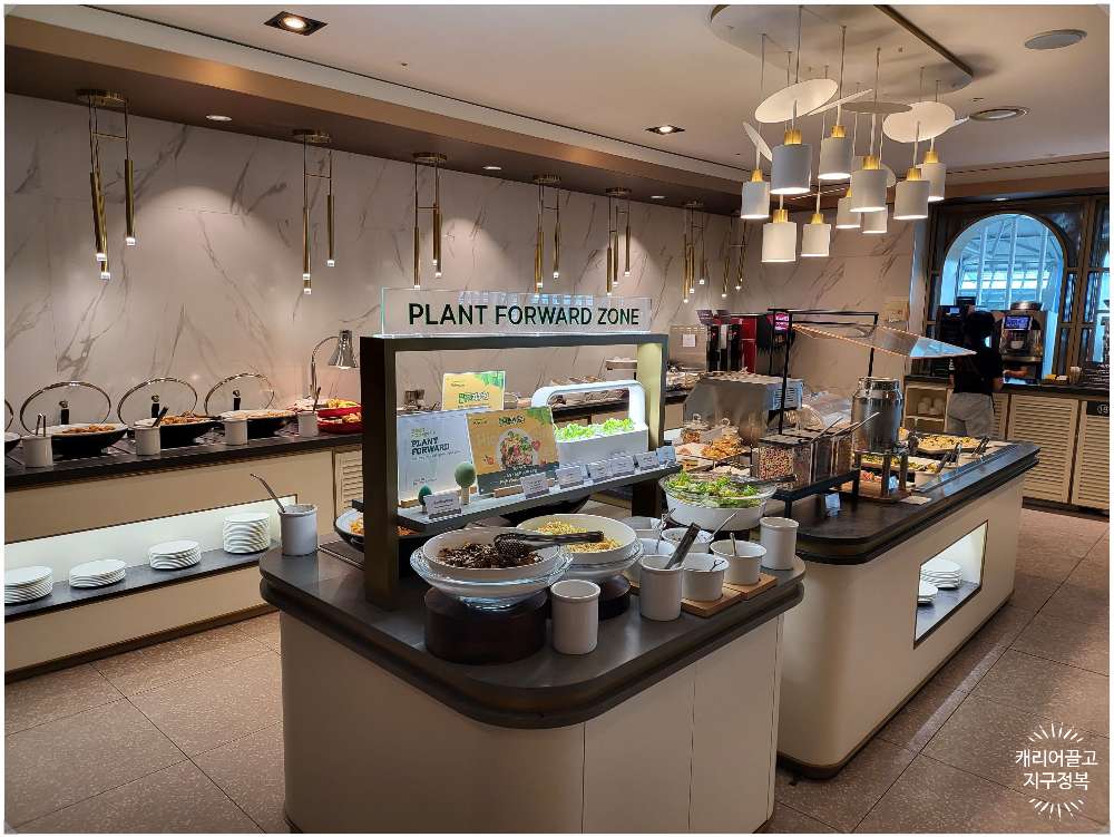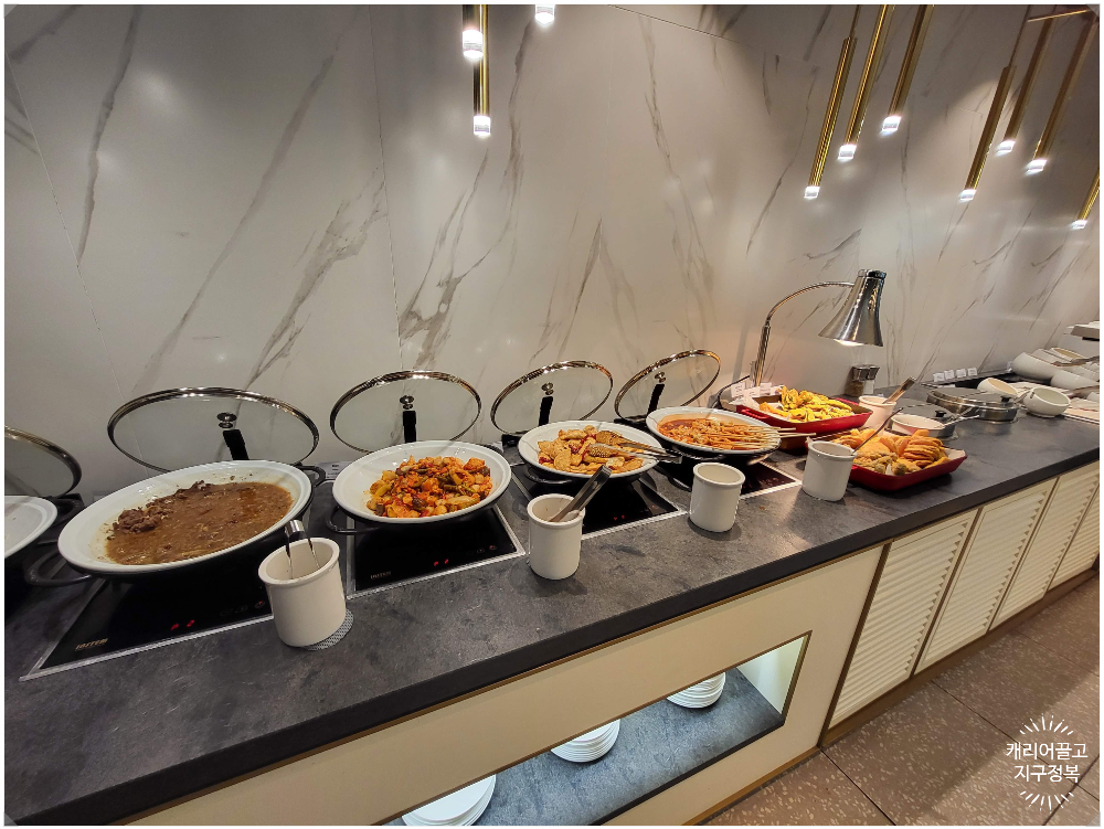 조금 발품을 팔아 동편 스카이 허브 라운지에 들어오시면, 북적이는 인파에 치이지 않고 편안하게 식사를 즐기실 수 있습니다. 회전율이 너무 빠른 서편 라운지는 음식이 텅텅 비어 있을 때도 많은데, 이곳은 음식 세팅도 아주 여유롭습니다.