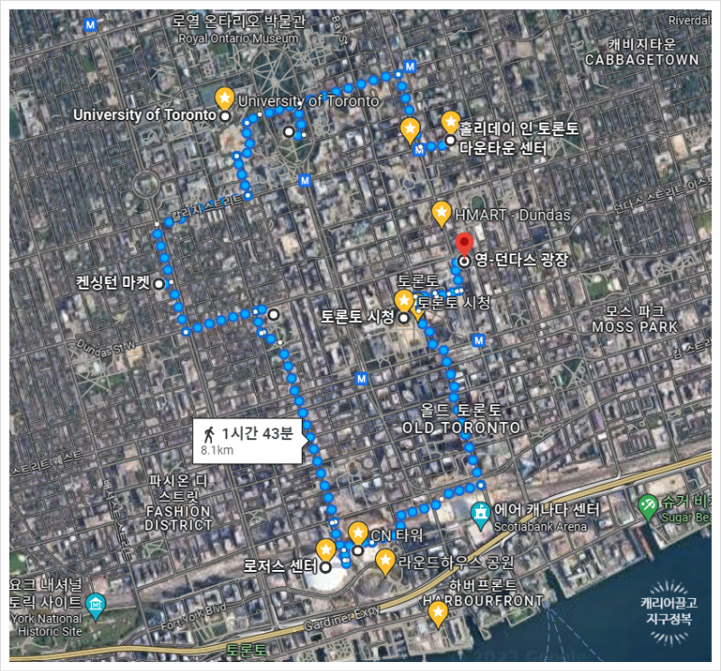 저희가 묵었던 홀리데이 인(Holiday Inn) 토론토 다운타운 센터 호텔에서 출발하여 한 바퀴를 휙 도는 알짜배기 1일 도보 코스는 아래와 같습니다.