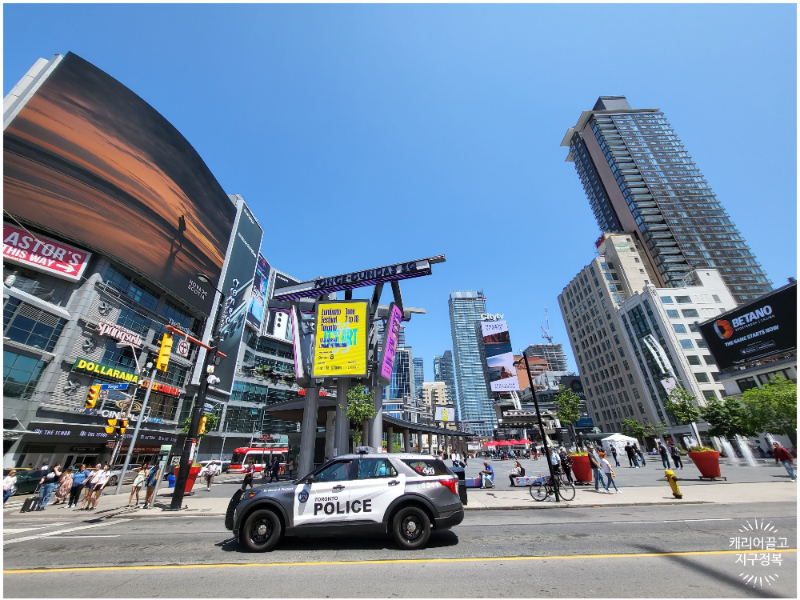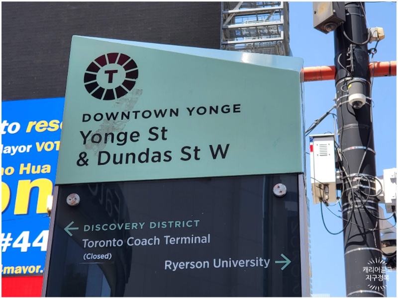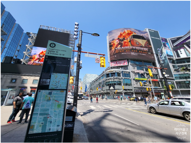시청에서 북쪽으로 발걸음을 옮기면 영 스트리트(Yonge St)와 만나는 번화가, 영-던다스 광장(Yonge-Dundas Square)이 나타납니다.