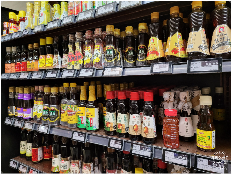올리브유, 포도씨유 등 한국 마트 진열장과 똑같이 세팅되어 있습니다. 맛있는 계란간장비빔밥을 위한 1등 공신, 오뚜기 참기름도 사이즈별로 완벽하게 준비되어 있습니다.