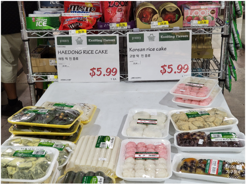 전자레인지에 돌려먹을 수 있는 햇반은 산처럼 쌓여 있고, 밥통이 있는 숙소라면 직접 밥을 지어먹을 수 있는 쌀도 종류별로 있습니다. 명절 기분을 낼 수 있는 쫀득한 송편까지 진열되어 있으니, 한국 식료품에 대해서는 정말 아무 걱정 없이 몸만 와도 될 수준입니다.