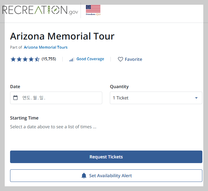 저처럼 낭패를 겪지 마시고, 애리조나호 관람 계획이 있으시다면 여행 전 반드시 아래 공식 사이트에서 원하는 시간대로 사전 예약을 하고 가시길 강력 추천합니다.