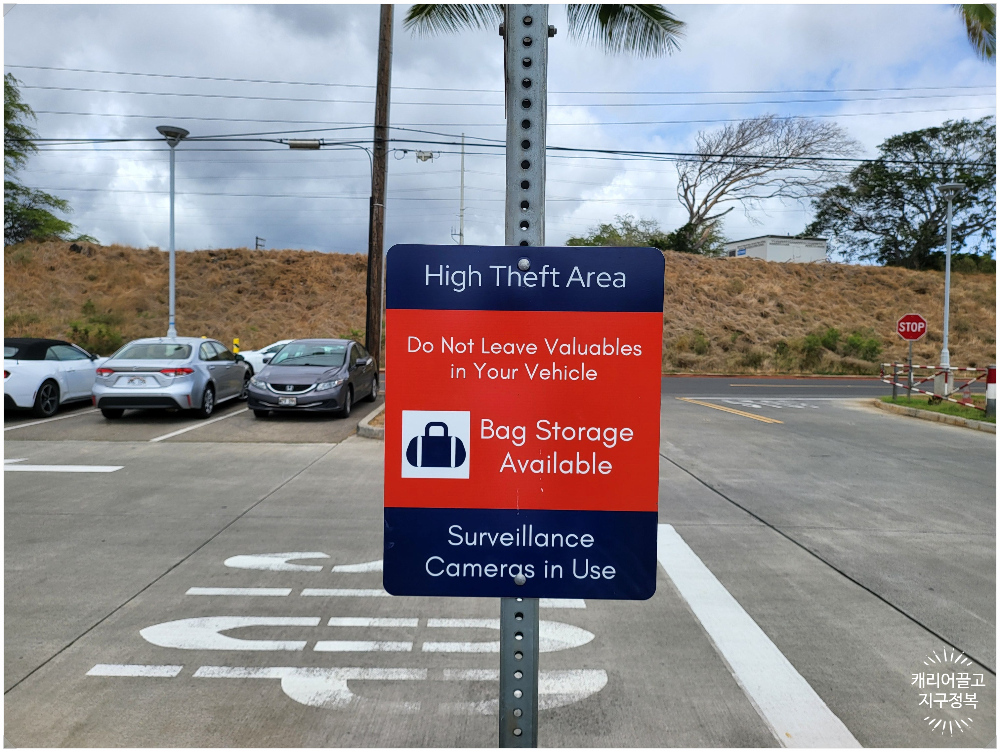 이곳에도 순찰 카메라가 있다고는 하지만, 도둑을 유혹하지 않도록 차량 뒷좌석이나 조수석에 동전 하나, 쇼핑백 하나도 절대 남겨두시면 안 됩니다. 모든 짐은 트렁크 깊숙이(밖에서 보이지 않게 가림막 필수) 숨겨두고 차 문을 잠그셔야 합니다.