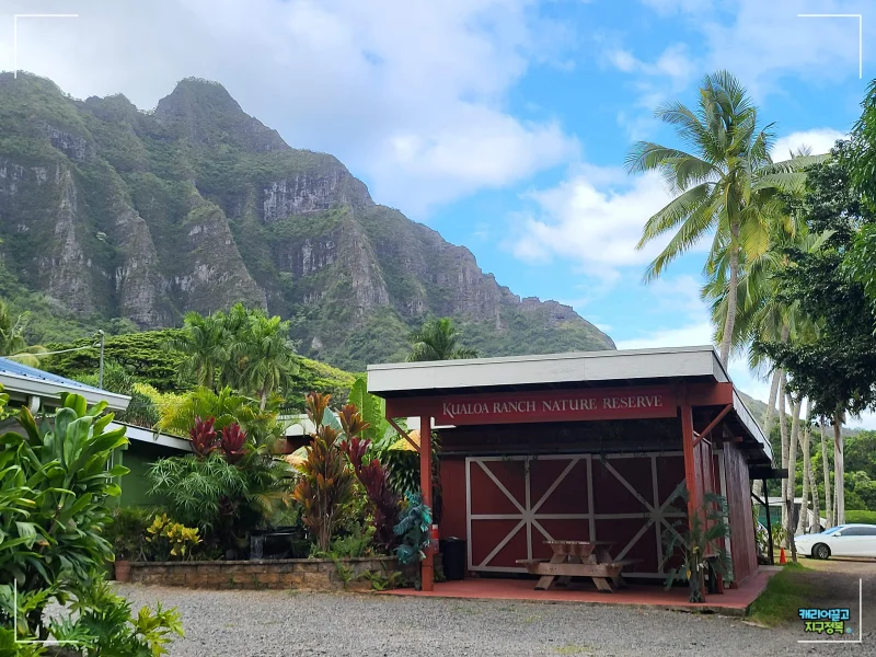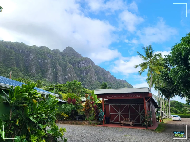 농장 뒤편으로는 쿠알로아 랜치를 감싸고 있는 병풍 같은 코올라우 산맥(Ko'olau Mountain Range)이 웅장하게 펼쳐져 있습니다. 쥐라기 공원에서 공룡들이 뛰어놀던 바로 그 대자연의 풍경입니다.