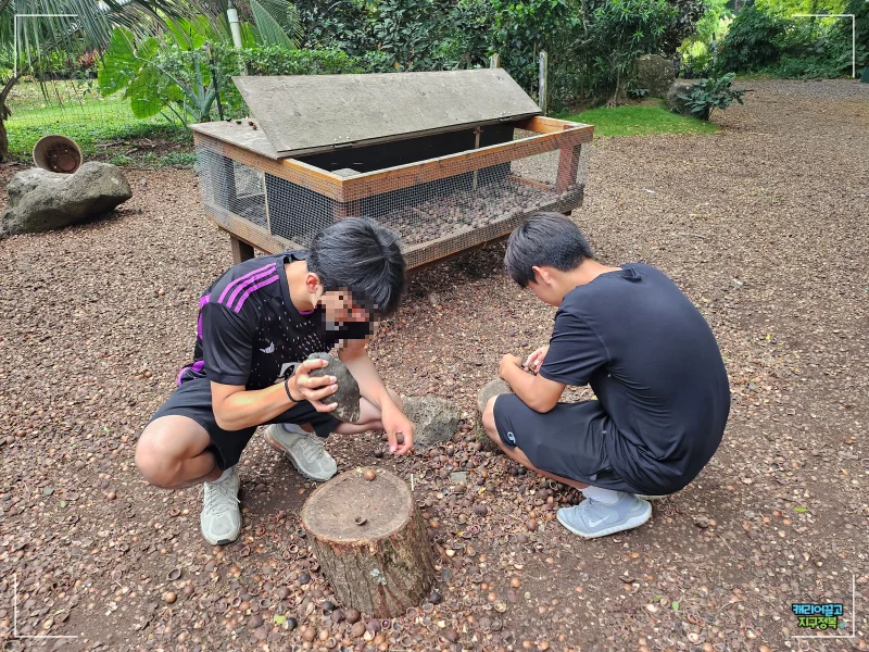 3. 야외에서 즐기는 무료 생 마카다미아 돌로 까기 체험은 하와이 여행의 소소하지만 확실한 재미를 선사합니다.