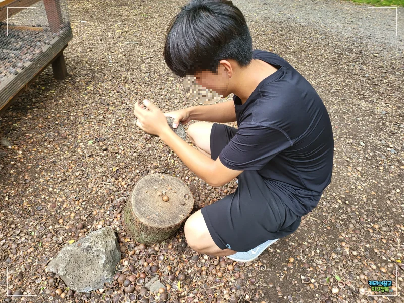체험 방법은 아주 간단명료합니다. 그냥 원시시대처럼 돌로 쾅! 하고 깨면 됩니다. 나무 그루터기 홈에 마카다미아를 잘 고정하고, 옆에 놓인 무거운 돌을 양손으로 들고 내리치면 되는데요.