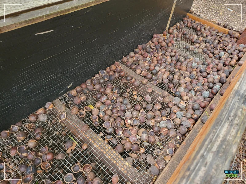 바닥에 수북하게 쌓인 저 껍질 잔해들이 보이시나요? 저 중에 꽤 많은 지분을 저희 가족이 차지하고 있습니다. 로스팅되거나 소금 간이 되지 않은 생 마카다미아는 우유처럼 부드럽고 눅진한 고소함이 일품이랍니다. 하와이 렌트카 여행 중이시라면 꼭 들러서 스트레스도 풀 겸 원시인 까기 체험을 즐겨보세요!
