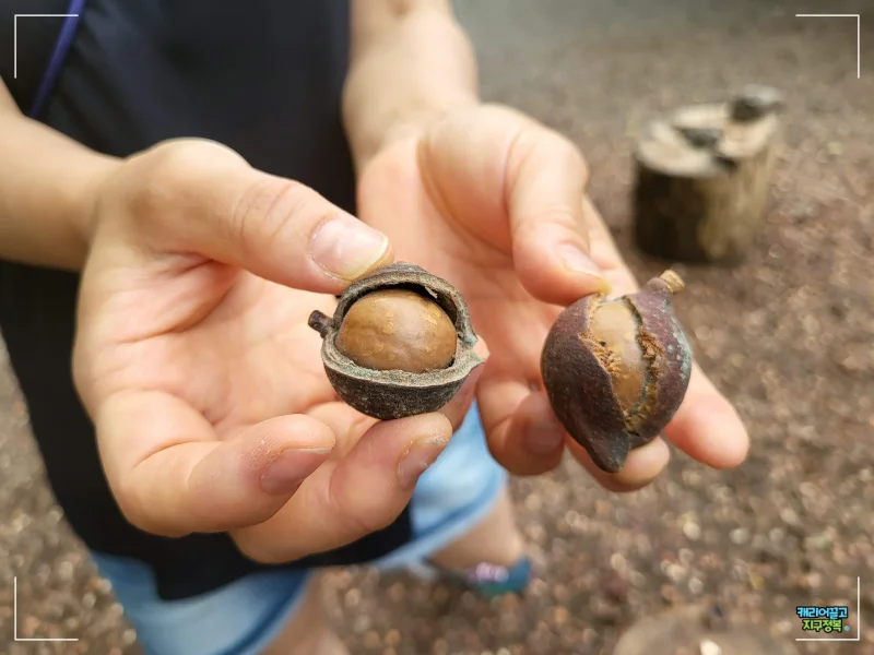 사실 쇼핑보다 이곳을 더욱 특별하게 만들어 주는 진짜 핵심 코스가 야외에 있습니다. 바로 가공되지 않은 자연산 생 마카다미아를 돌로 직접 깨서 먹어보는 체험장입니다.