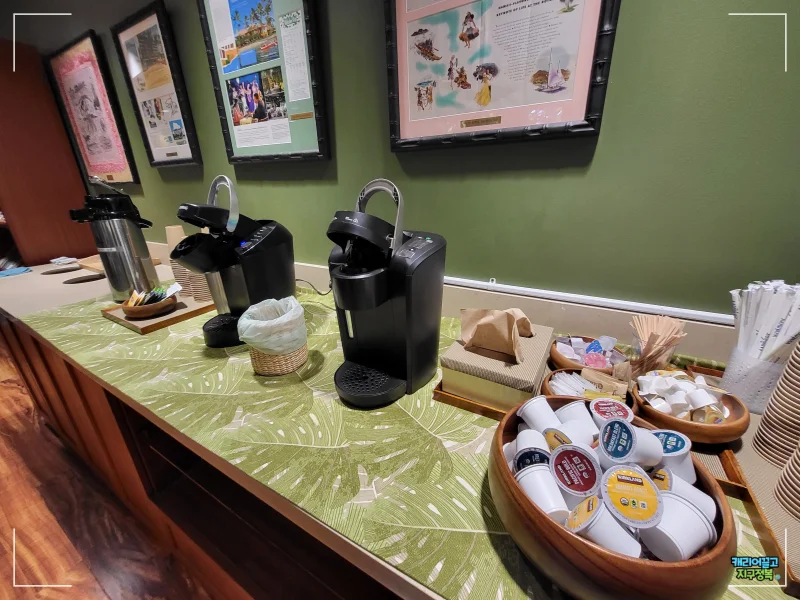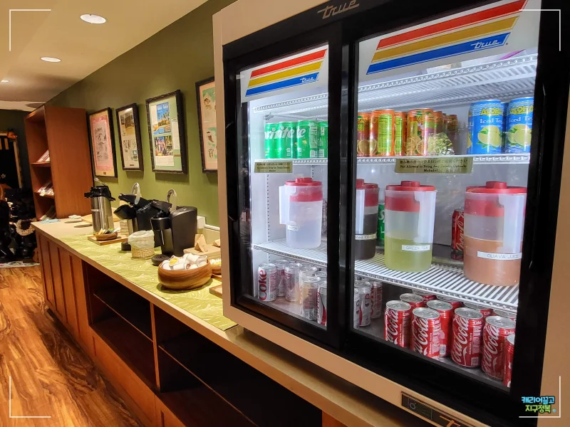 내부에서 제공되는 식음료는 아래 사진에서 보시는 커피와 캔 음료가 전부입니다. 허기를 채울 만한 스낵이나 베이커리류는 기대하지 않으시는 것이 좋습니다.