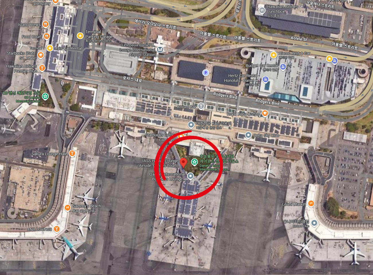 에어프레미아 탑승 구역인 G gate 부근에서 공항 내 셔틀버스를 타면 라운지가 있는 가든 코트(Garden Court) 근처까지 이동할 수 있습니다. 호놀룰루 공항은 독특하게도 외부 공기가 그대로 통하는 개방형 구조(Open-air)로 설계되어 있는데, 시원한 바닷바람을 맞을 땐 좋지만 한낮에는 다소 덥게 느껴질 수 있습니다. 그래서 시원한 에어컨이 나오는 라운지가 더욱 간절해지기도 합니다.
