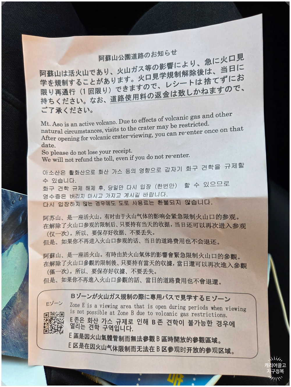 통행료 1,000엔(승용차 기준)을 내면 올라갈 수 있는데, 이때 중요한 안내문을 함께 줍니다.