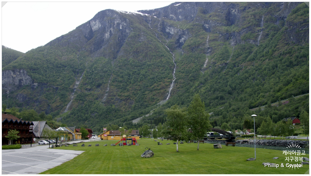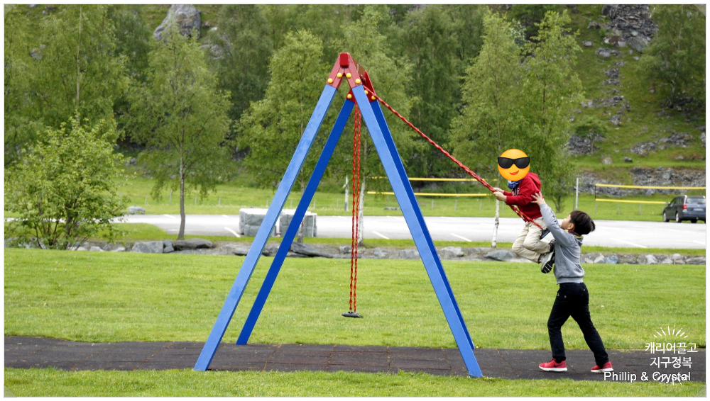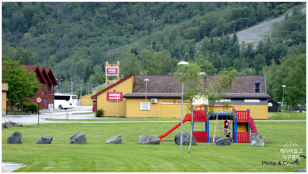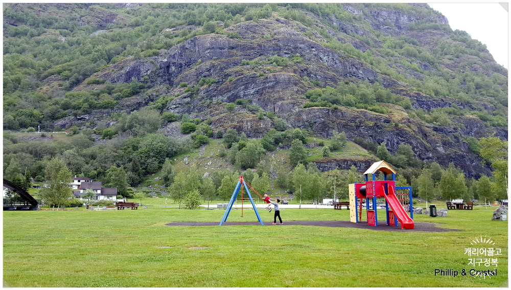 노르웨이 플롬 마을은 천년 가까이 된 오래되고 아름다운 마을입니다. 플롬 기차역에서는 미르달을 가는 산악 관광기차도 있습니다. 100년 된 관광 기차입니다. 또한 플롬은 송네 피오르에 있어서 유람선도 입항을 합니다. 마을을 작은데 관광객이 많이 찾아오는 유명한 마을입니다. 여기 놀이터가 하나 있는데. 매우 아름다운 경치와 함께 있는 멋진 놀이터입니다.