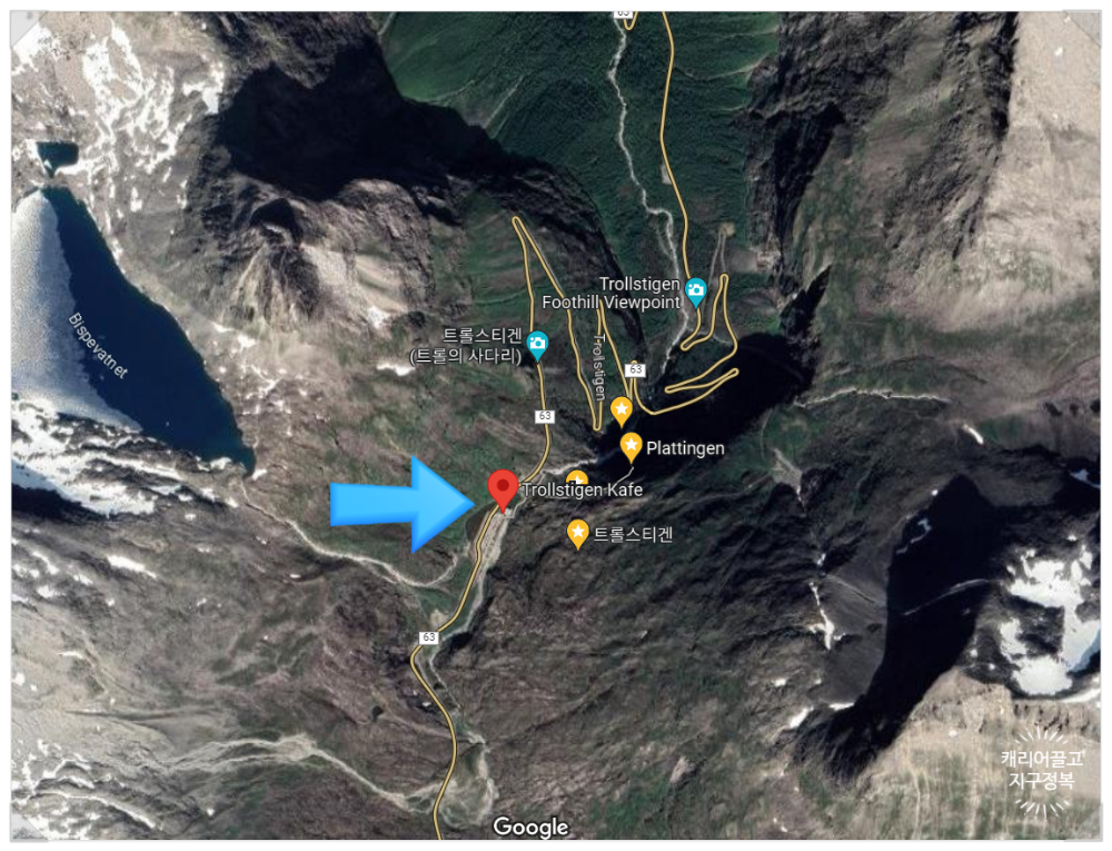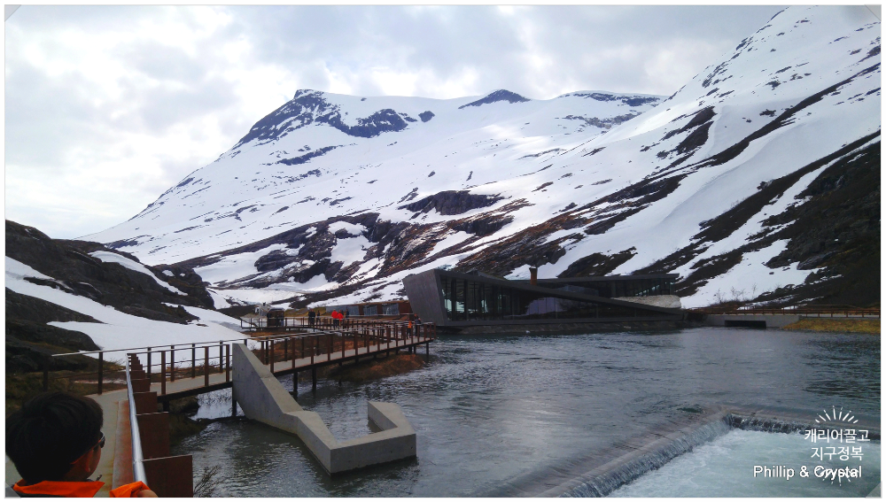 노르웨이 트롤스티겐 위에는 화장실이 딸린 주차장이 있습니다. 눈이 녹아서 만들어진 계곡도 멋지게 만들어져 있습니다.  2023년 8월, 지금은 휴점으로 되어있지만 카페도 있습니다. 산을 넘어가기 전에, 이곳에서 충분히 휴식을 하고 출발해야겠습니다.