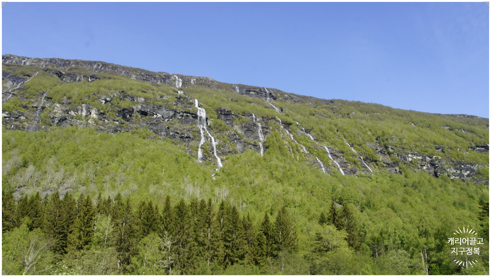 6월의 노르웨이는 산 위의 눈이 녹아내린 덕분에 어느 곳을 봐도 폭포가 있습니다.