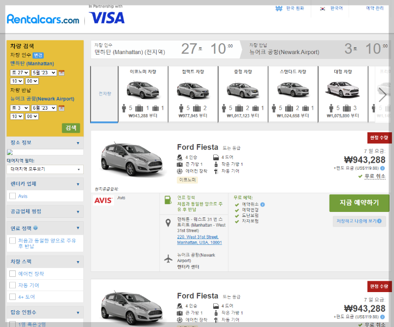 허츠(Hertz) 렌터카나 어비스(Avis) 렌터카 공식사이트보다는 대부분 저렴하게 나옵니다.